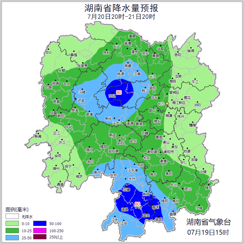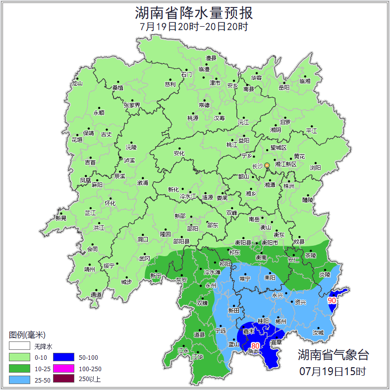 今天晚上(19日)至明天白天,湘南阴天有中到大雨,其中郴州(桂阳、宜章、嘉禾、临武、桂东)、永州(蓝山)暴雨,其他地区多云有阵雨或雷阵雨;北风2~3级,雷雨时阵风7~9级;最高气温湘北、湘东35~37℃,其他地区30~34℃,最低气温24~28℃。