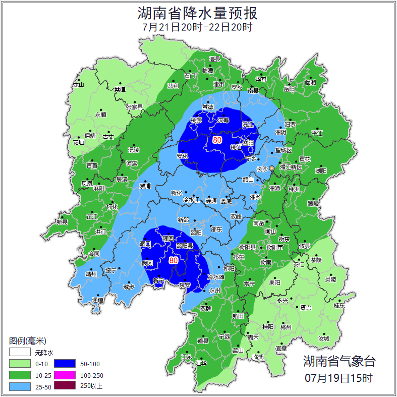 20日晚上至21日白天,湘东多云有阵雨或雷阵雨,其他地区阴天,大部分地区有中到大雨,其中常德(市区、桃源)、益阳(安化、桃江)、娄底(新化)、永州(市区、道县、双牌、宁远、蓝山、新田)、郴州(桂阳、嘉禾、临武)暴雨;北风3~4级,雷雨时阵风7~9级;最高气温湘东34~36℃,其他地区30~34℃,最低气温23~28℃。