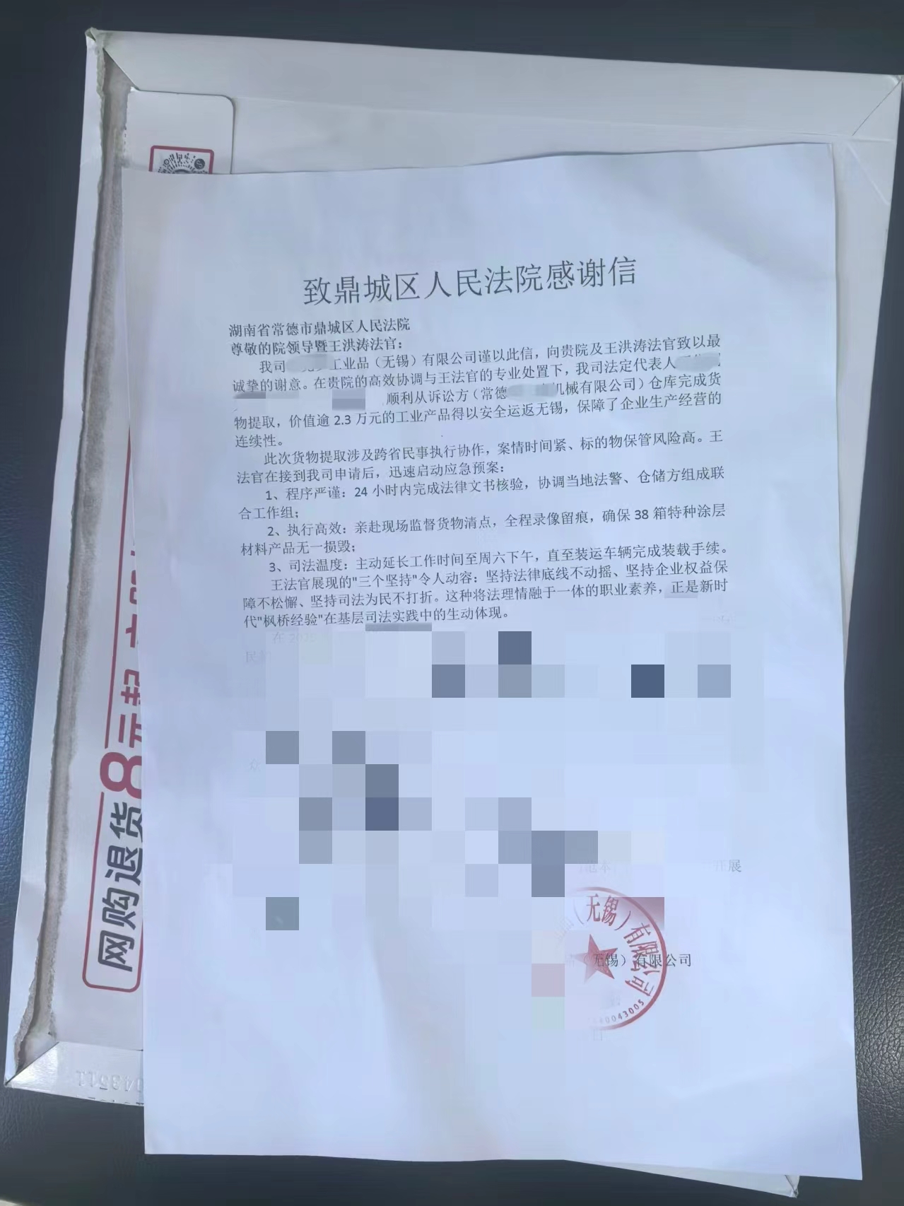 “感谢贵院的高效协调与王法官的专业处置,我司顺利从诉讼方仓库完成货物提取,价值数万元的工业产品得以安全运返无锡,保障了企业生产经营的连续性!”鼎城区人民法院灌溪法庭收到一封来自江苏无锡某公司的感谢信,揭开了一段跨越千里的司法为民故事。