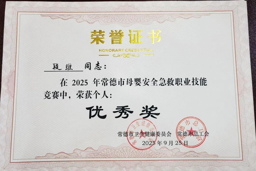 2025年9月25日,由常德市第四人民医院妇产科医生李曼婉、麻醉科医生段维与鼎城区妇幼保健院四名医务人员组成的鼎城区代表队,在常德市卫生健康委员会主办的 “2025年常德市母婴安全急救职业技能竞赛”中,荣获团体三等奖!