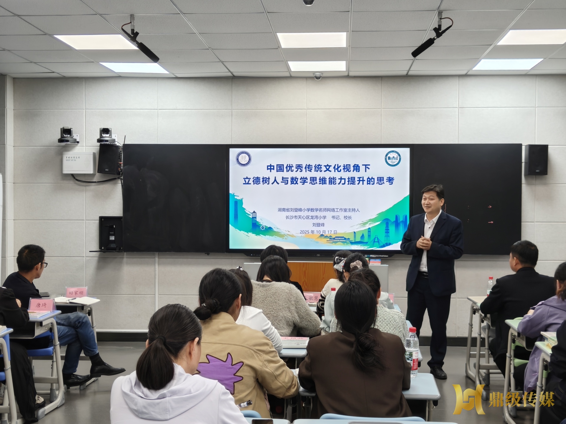 两节高质量的研讨课后,湖南省刘登峰小学数学名师网络工作室领衔名师刘登峰带来了《中国优秀传统文化视角下立德树人与数学思维能力提升的思考》的专家讲座,从中华优秀传统文化的深厚底蕴出发,深刻阐述了在数学教学中渗透立德树人根本任务的路径与方法,并分享了如何借助传统文化元素启迪学生数学思维、提升核心素养的独到见解。