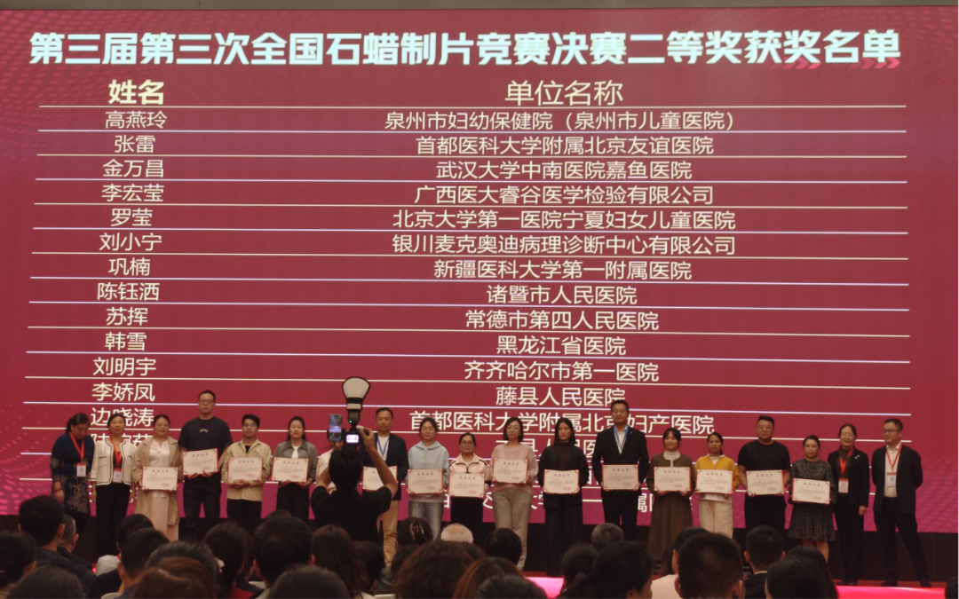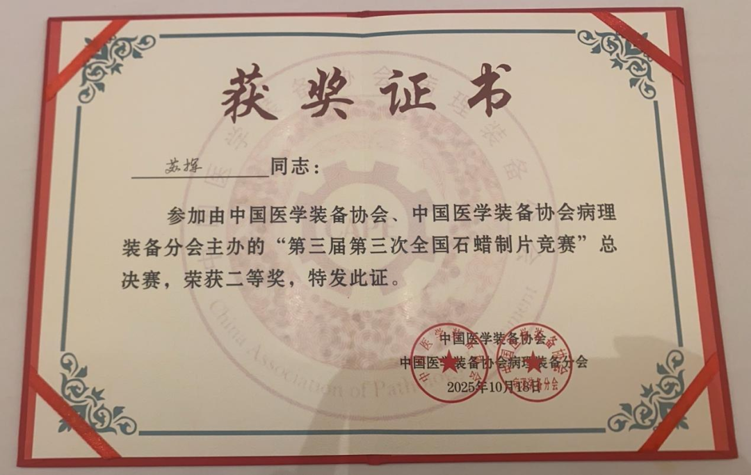 在刚刚落幕的由中国医学装备协会、中国医学装备协会病理装备分会主办的第三届第三次全国石蜡制片竞赛中,我院病理科苏挥主管技师凭借精湛技艺与稳定发挥,从296位参赛者中脱颖而出,荣获全国二等奖!