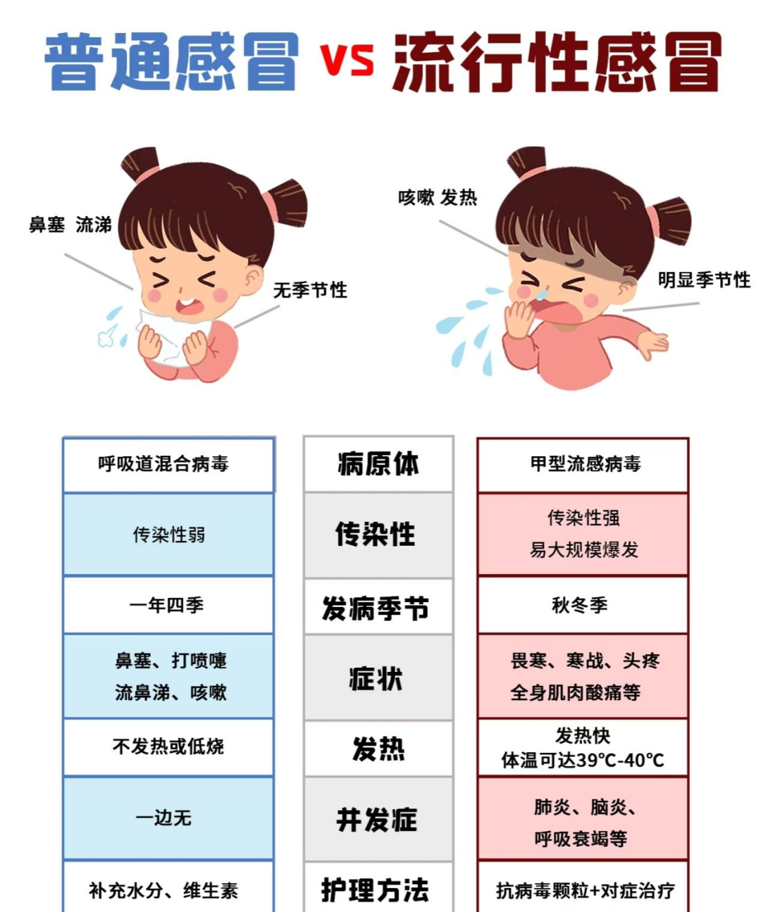 普通感冒多由鼻病毒、冠状病毒等引起,症状较轻,主要是打喷嚏、流鼻涕、轻微咳嗽,一般1周左右就能自愈,很少出现全身酸痛、高热;而流感是由流感病毒(甲、乙、丙型为主)引起的急性呼吸道传染病,传染性极强,主要通过飞沫传播,也能通过接触被病毒污染的手、物品传播,症状更严重——常突然发热(体温可达39-40℃)、头痛、肌肉酸痛、乏力,还可能伴随咳嗽、咽痛、呕吐腹泻(儿童更常见),严重时会引发肺炎、心肌炎等并发症,尤其老人、小孩、孕妇和慢性病患者,风险更高。