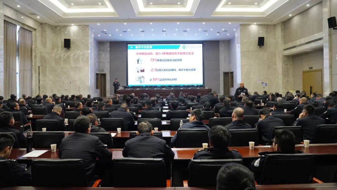 讲座现场,郭俊部长以“健康科普——从脑卒中道来”为题,结合公安干警职业强度高、压力大的特点,用通俗易懂的语言,讲解了脑卒中的危险因素、快速识别方法和急救要点。他强调“时间就是大脑”的救治原则,并提供了具体可行的日常预防指导,帮助干警们筑牢健康防护意识。