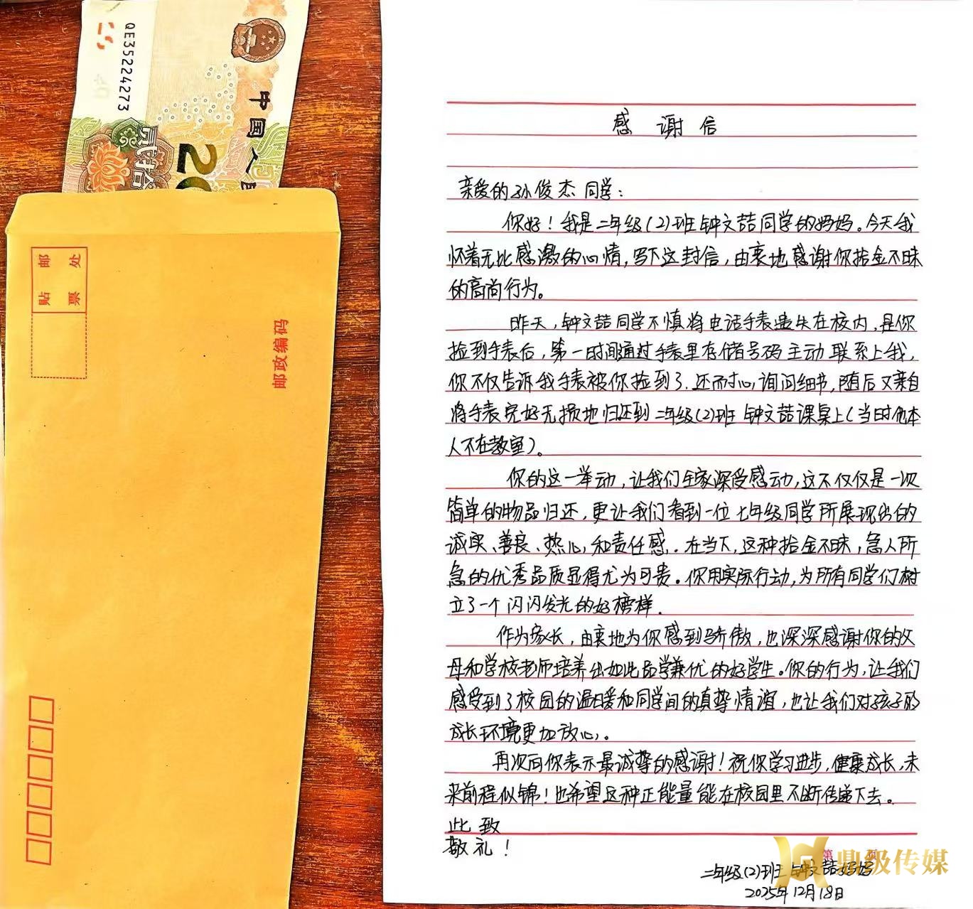 12月18日家长专程来到学校,不仅向孙俊杰递上了情真意切的感谢信,还准备了感谢金表达谢意。面对感谢金,孙俊杰腼腆而坚定地婉拒:“这是我应该做的,老师一直教导我们要诚实守信,捡到东西归还失主是本分。”