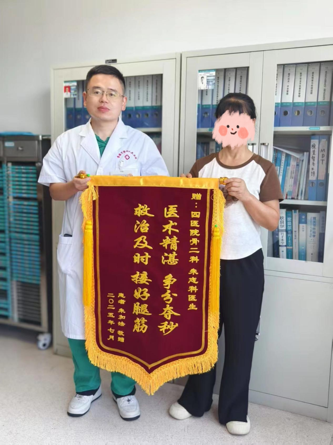 70岁于先生,双膝重度骨性关节炎折磨15年,行走极度困难。朱志科医生为其制定分期手术方案,先后成功实施右侧及左侧人工全膝关节置换术。两次手术精准稳定,功能恢复良好,患者对疗效极为满意,最终赠送锦旗以表感激。