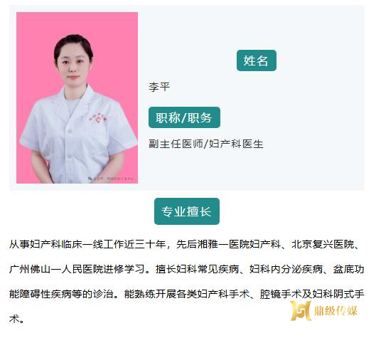 妇产科专家:专注各类妇科常见疾病诊疗、妇科微创手术、宫颈疾病规范化治疗以及女性内分泌调理,同时深耕孕期保健、产前检查、孕期并发症诊疗及产后康复指导,耐心解答女性健康以及孕期各类疑问,精准把控女性与母婴健康,为女性健康以及孕妈咪全程保驾护航,缓解焦虑,守护健康与平安。