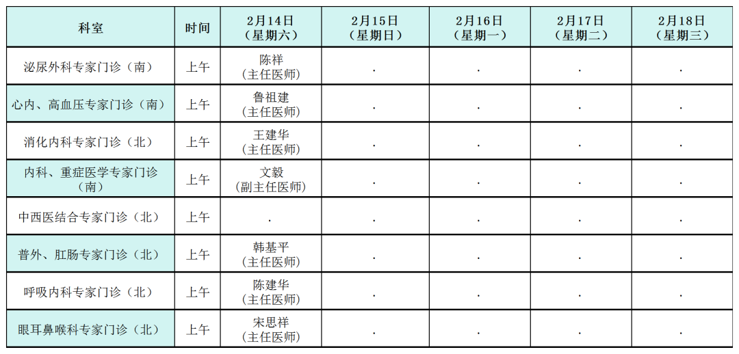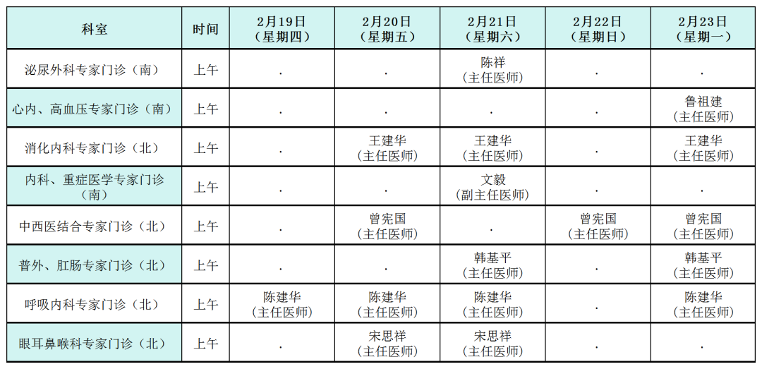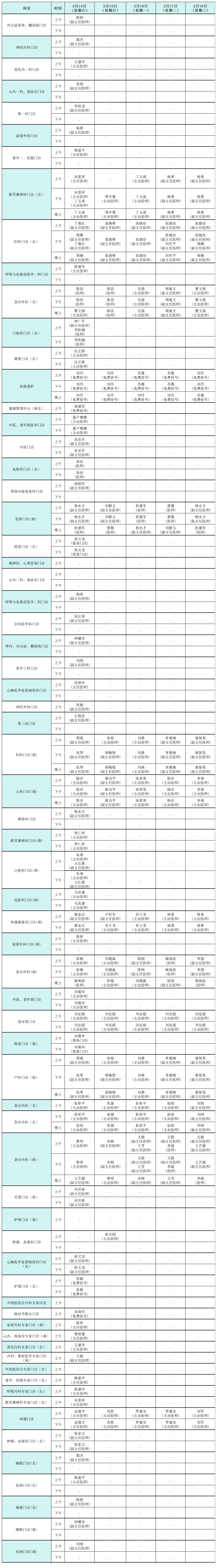 中西医结合专家门诊:正月初四、初六、初七上午(曾宪国)普外科、肛肠科:正月初五上午、正月初七全天(韩基平)呼吸内科:正月初三、初四全天,正月初五上午,正月初七全天(陈建华)肾病风湿免疫科:正月初三、初四全天,正月初五上午,正月初七全天。内分泌营养科:正月初三、初四全天,正月初五上午,正月初七全天。神经内科:正月初三、初四全天,正月初五、初六上午,正月初七全天。消化内科:正月初三、初四全天,正月初五上午,正月初七全天。呼吸与危重症医学科:正月初三、初四全天,正月初五上午,正月初七全天。骨科:正月初三、初四全天,正月初六上午,正月初七全天。泌尿外科:正月初三、初四全天,正月初六上午,正月初七全天。普外科、肛肠科:正月初三、初四全天,正月初五上午,正月初七全天。减重门诊:正月初三、初四全天,正月初五上午,正月初七全天。疝病门诊:正月初三、初四全天,正月初五上午,正月初七全天。睡眠门诊:正月初三、初四全天,正月初五、正月初六上午,正月初七全天。疼痛康复科理疗室:腊月二十八、正月初六、初七上午。呼吸与危重症医学科:正月初三、初四全天,正月初六上午,正月初七全天。全科医学科:正月初三、初四、初五上午,正月初七全天。神内内分泌科:正月初三、初四全天,正月初六上午,正月初七全天。感染科:正月初三、初四全天,正月初五上午,正月初七全天。肿瘤血液科:腊月二十八上午,正月初三、初四、初六、初七全天。泌尿外科:正月初三、初四全天,正月初五上午,正月初七全天。普外科:正月初三、初四全天,正月初六上午,正月初七全天。心胸乳甲外科:正月初三、初四全天,正月初六上午,正月初七全天。骨科:正月初三、初四全天,正月初五上午,正月初七全天。疝病门诊:正月初三、初四全天,正月初六上午,正月初七全天。睡眠门诊:正月初三、初四全天,正月初六上午,正月初七全天。