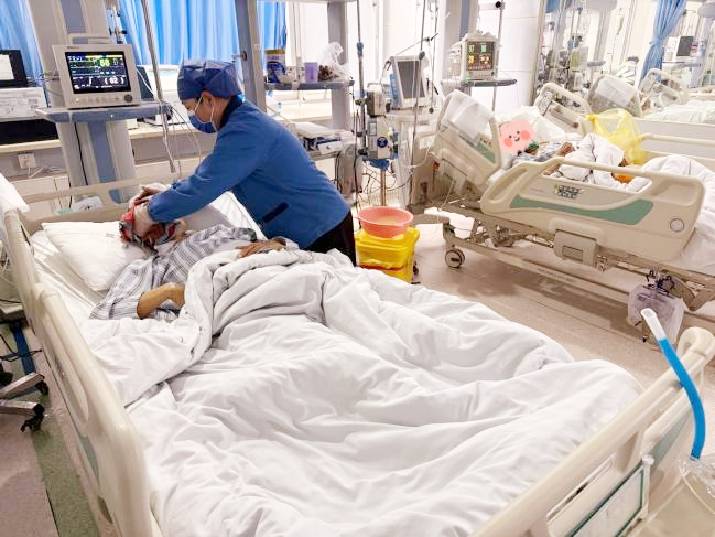 袁爷爷,是我们监护室的“老人”了,由于疾病原因,他无法转至普通病房与家人团聚,在监护室已经半年了,除夕这天,管床护士刘凤炎和护工阿姨为他换上了新的衣服、床单、被套,还给他修剪指甲,刮了胡子,告诉爷爷过年了,祝爷爷新年快乐!袁爷爷开心的笑了。