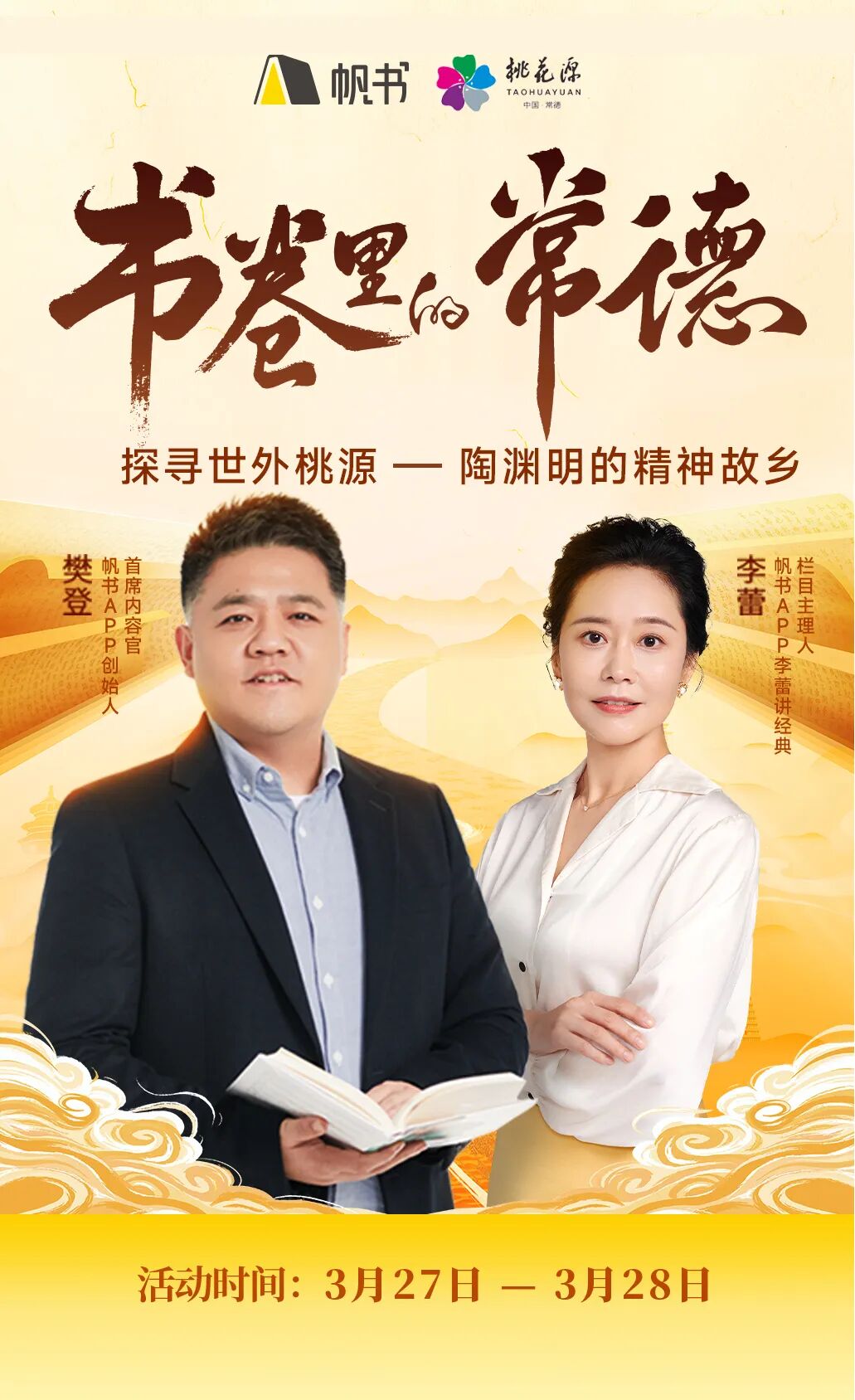 这里,是世人心中桃花源的原乡与代名词:城头山镌刻着六千年稻作文明的根脉,柳叶湖荡漾着一城山水的诗意,诗墙承载着千年文脉的厚重,河街氤氲着人间烟火的温情。而这片土地最动人的,是桃花源里跨越千年的古今相融——既有岁月沉淀的文化底蕴,更有常德最鲜活、最本真的文化底色。当帆书遇见桃花源,一场关于“书卷里的常德”的对话,便有了最诗意的注脚。这不仅仅是一次踏青访古,更是一场以山水为卷、以文化为脉的深度寻访。樊登老师将围绕这片土地滋养出的陶渊明、刘禹锡、苏东坡等文豪巨擘展开,探讨千年隐逸文化如何与当代心灵产生共鸣。